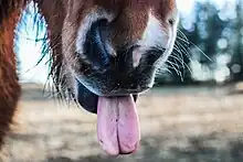 D'après les éthologues Gerry et Julia Karen Neugebauer, le cheval utilise sa langue dans les comportements de léchage, de mâchouille, de soumission, lorsqu'il baille, et lorsqu'il boit[15]. Il n'utilise généralement pas sa langue en cas de toilettage mutuel, au contraire des bovins[16]. Lors d'une exploration rapprochée, le cheval examine un nouvel objet, le flaire, et si l'odeur lui plaît, peut le toucher et le goûter en utilisant ses lèvres, ses vibrisses, ses dents et sa langue[17].