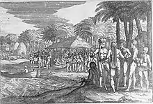 Les premiers européens à pénétrer dans la région sont les hollandais Willem Schouten et Jacob Le Maire qui accostent à Futuna, Niuatoputapu et Niuafoʻou en 1616. De cette rencontre brève (deux semaines), les Hollandais ramènent une liste de mots qui permet au linguiste Hadrian Reland de montrer les similitudes entre le futunien, le malgache, le malais et d'autres langues austronésiennes en 1706[25],[26]. À la suite de cette rencontre, les langues polynésiennes locales (dont le futunien) ont emprunté le mot pusa « boîte » issu du hollandais[Note 5] bus ou bos[27]. Ce contact reste toutefois anecdotique par rapport à l'histoire linguistique de Wallis-et-Futuna.