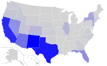 Jusqu'à 11 millions d'Américains seraient locuteurs du français en langue seconde[20]. Le français est la deuxième langue étrangère la plus apprise après l'espagnol, mais quatre fois moins apprise que celle-ci. Le français était la langue la plus apprise jusqu'en 1968, l'année suivante l'espagnol l'a définitivement détrônée[21]. Les francophones sont surtout concentrés dans le sud de la Louisiane et le nord de la Nouvelle-Angleterre, près du Canada. En 2010, c'est la deuxième langue la plus parlée, après l'anglais, dans deux États (voir tableau ci-dessus) :