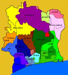 Ainsi se met en place le système linguistique que les colonisateurs vont trouver aux XIXe siècle et XXe siècle, et auquel ils surimposeront le français, aujourd'hui langue officielle et d'enseignement de la Côte d'Ivoire[8].