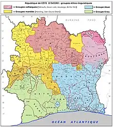 La Côte d'Ivoire est un pays classé parmi les pays à forte hétérogénéité linguistique[2] et on dénombre une langue officielle, le français, et environ une soixantaine de langues locales dont les plus importantes sont le dioula, le baoulé, le sénoufo et le bété[2].