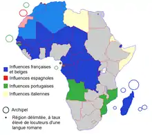 Le français est la langue romane la plus représentée sur le continent africain, avec 27 pays ayant le français comme langue officielle ou seconde, dont le plus peuplé est la République Démocratique du Congo qui compte près de 80 millions d'habitants. Ces états constituent l'Afrique francophone. La langue portugaise quant à elle compte, d'après les estimations de 2016, plus de 40 millions de locuteurs, répartis sur les 6 pays de l'ancienne Afrique portugaise.