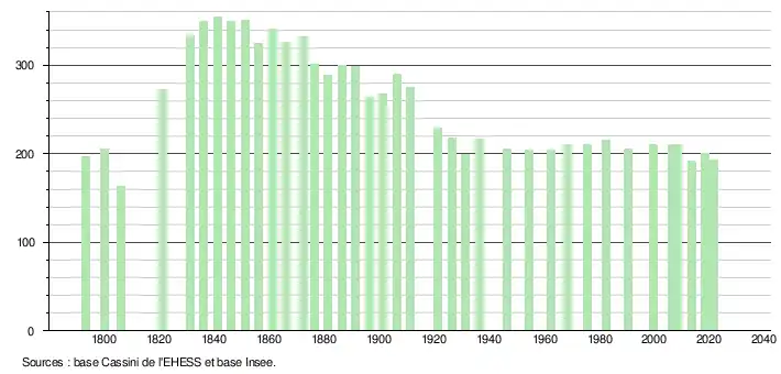 L'évolution du nombre d'habitants est connue à travers les recensements de la population effectués dans la commune depuis 1793. Pour les communes de moins de 10 000 habitants, une enquête de recensement portant sur toute la population est réalisée tous les cinq ans, les populations légales des années intermédiaires étant quant à elles estimées par interpolation ou extrapolation[28]. Pour la commune, le premier recensement exhaustif entrant dans le cadre du nouveau dispositif a été réalisé en 2008[29].