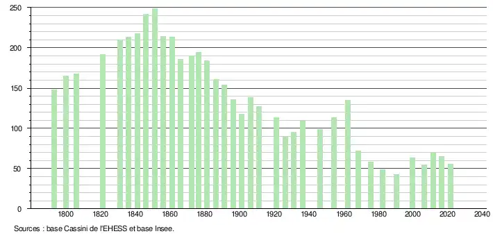 L'évolution du nombre d'habitants est connue à travers les recensements de la population effectués dans la commune depuis 1793. Pour les communes de moins de 10 000 habitants, une enquête de recensement portant sur toute la population est réalisée tous les cinq ans, les populations légales des années intermédiaires étant quant à elles estimées par interpolation ou extrapolation[15]. Pour la commune, le premier recensement exhaustif entrant dans le cadre du nouveau dispositif a été réalisé en 2006[16].