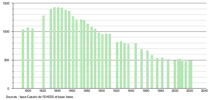 - Population municipale légale en vigueur au 1er janvier 2024, millésimée 2021, définie dans les limites territoriales en vigueur au 1er janvier 2023, date de référence statistique : 1er janvier 2021.