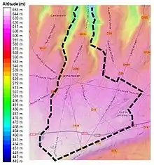 Les variations d'altitude sont importantes sur le territoire de la commune. L'altitude minimale est de 442 mètres, l'altitude maximale est de 647 mètres. L'altitude moyenne est de 545 mètres, et l'hôtel de ville se situe quant à lui à 580 mètres.
