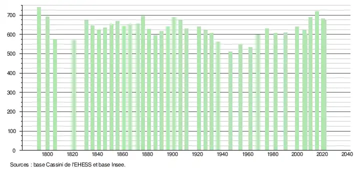 L'évolution du nombre d'habitants est connue à travers les recensements de la population effectués dans la commune depuis 1793. Pour les communes de moins de 10 000 habitants, une enquête de recensement portant sur toute la population est réalisée tous les cinq ans, les populations légales des années intermédiaires étant quant à elles estimées par interpolation ou extrapolation[19]. Pour la commune, le premier recensement exhaustif entrant dans le cadre du nouveau dispositif a été réalisé en 2005[20].