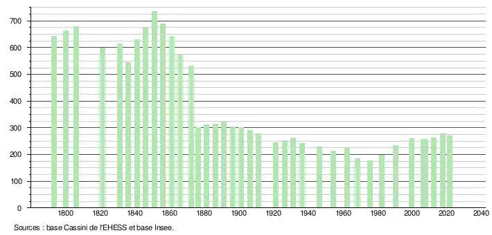 L'évolution du nombre d'habitants est connue à travers les recensements de la population effectués dans la commune depuis 1793. Pour les communes de moins de 10 000 habitants, une enquête de recensement portant sur toute la population est réalisée tous les cinq ans, les populations légales des années intermédiaires étant quant à elles estimées par interpolation ou extrapolation[20]. Pour la commune, le premier recensement exhaustif entrant dans le cadre du nouveau dispositif a été réalisé en 2007[21].