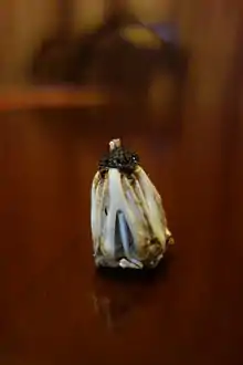 La lanterne d'Aristote vue de profil, fermée et entière, sur un oursin Kina coupé en deux (et vidé de ses organes).