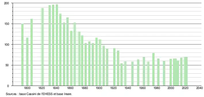 L'évolution du nombre d'habitants est connue à travers les recensements de la population effectués dans la commune depuis 1793. Pour les communes de moins de 10 000 habitants, une enquête de recensement portant sur toute la population est réalisée tous les cinq ans, les populations légales des années intermédiaires étant quant à elles estimées par interpolation ou extrapolation[24]. Pour la commune, le premier recensement exhaustif entrant dans le cadre du nouveau dispositif a été réalisé en 2004[25].