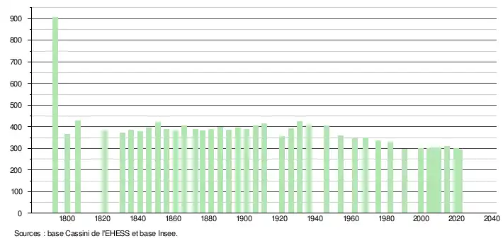 L'évolution du nombre d'habitants est connue à travers les recensements de la population effectués dans la commune depuis 1793. Pour les communes de moins de 10 000 habitants, une enquête de recensement portant sur toute la population est réalisée tous les cinq ans, les populations légales des années intermédiaires étant quant à elles estimées par interpolation ou extrapolation[19]. Pour la commune, le premier recensement exhaustif entrant dans le cadre du nouveau dispositif a été réalisé en 2004[20].