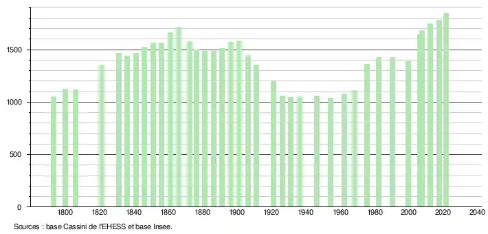 L'évolution du nombre d'habitants est connue à travers les recensements de la population effectués dans la commune depuis 1793. Pour les communes de moins de 10 000 habitants, une enquête de recensement portant sur toute la population est réalisée tous les cinq ans, les populations légales des années intermédiaires étant quant à elles estimées par interpolation ou extrapolation[35]. Pour la commune, le premier recensement exhaustif entrant dans le cadre du nouveau dispositif a été réalisé en 2007[36].