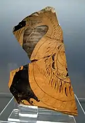 Laomédon fait appel à un troisième constructeur selon le poète Pindare[123] : alors que les dieux s'apprêtent à achever la ceinture murée de la ville telle une couronne[124], le roi d'Égine, Éaque, dont le royaume insulaire se trouve au Sud d'Athènes en Grèce, se voit appelé — voire sommé — et associé au travail divin ; ainsi en avait déterminé le Destin afin que la section des remparts que le simple mortel Éaque a la charge de dresser — nécessairement imparfaite car il ne s'agit pas d'une œuvre divine qui est indestructible naturellement — puisse s'écrouler au milieu de noirs tourbillons de fumée et des ravages sanglants de la guerre à venir[125]. Cela fait d'ailleurs écho à la mise en garde sur la fragilité du mur qu'adresse Andromaque à son époux Hector, petit-fils de Laomédon, lors de la guerre de Troie homérique[note 5]. À peine le mur est-il achevé que trois serpents (ou dragons) d'un gris vert-bleuté s'élancent contre ces retranchements, deux tombent dans le fossé et roulent au pied d'une tour où ils expirent épouvantés ; mais le troisième se jette dans la ville sous d'horribles sifflements. Alors Apollon, chantre des prophéties, méditant sur ce funeste présage, fait entendre ces paroles : « Je vois Pergame (Troie) prise par cet endroit même que tes mains viennent de fortifier, ô Éaque ! ainsi me l'expliquent les prodiges que nous envoie le fils de Zeus, le tonnant. Tes descendants ne sont point étrangers à cette catastrophe : je vois la première [génération] la commencer et la troisième la consommer. » Héraclès conduira un premier assaut contre la ville au côté de Télamon, le fils d'Éaque, et les arrière-neveux de ce dernier prendront définitivement la ville après la guerre de Troie que nous retrace partiellement l’Iliade : ce sont Néoptolème, le fils d'Achille descendant d'Éaque par son frère Pélée et Épéios fils de Panopée par un autre fils du roi, Phocos, ces deux composant avec le stratagème du Cheval de Troie pour franchir la muraille[126],[127]. À la suite des travaux, Apollon s'éloigne et s'en va vers le fleuve de Troade Xanthe (aussi appelé Scamandre) auprès duquel il a laissé paître ses coursiers, puis il se retire chez les belliqueuses Amazones et dans les régions que l'Ister arrose[note 6]. Poséidon, quant à lui, laisse Éaque retourner à Égine, et dirige ses coursiers brillants d'or vers les hauteurs de Corinthe pour contempler les jeux qu'on y célèbre en son honneur[123].