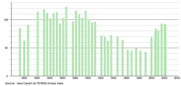 | L'évolution du nombre d'habitants est connue à travers les recensements de la population effectués dans la commune depuis 1793. Pour les communes de moins de 10 000 habitants, une enquête de recensement portant sur toute la population est réalisée tous les cinq ans, les populations légales des années intermédiaires étant quant à elles estimées par interpolation ou extrapolation[17]. Pour la commune, le premier recensement exhaustif entrant dans le cadre du nouveau dispositif a été réalisé en 2005[18]. En 2021, la commune comptait 91 habitants[Note 3], en diminution de 2,15 % par rapport à 2015 (Hautes-Pyrénées : +1,04 %, France hors Mayotte : +1,84 %). |