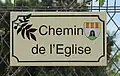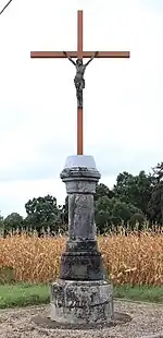 D'argent à la colline de sinople sommée d'une pierre de sable chargée d'une croix latine du champ, au chef cousu d'or chargé de trois pals de gueules. |