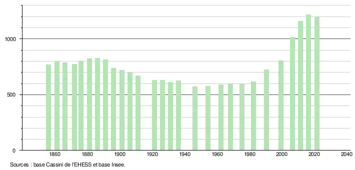 L'évolution du nombre d'habitants est connue à travers les recensements de la population effectués dans la commune depuis 1856. Pour les communes de moins de 10 000 habitants, une enquête de recensement portant sur toute la population est réalisée tous les cinq ans, les populations légales des années intermédiaires étant quant à elles estimées par interpolation ou extrapolation[33]. Pour la commune, le premier recensement exhaustif entrant dans le cadre du nouveau dispositif a été réalisé en 2006[34].