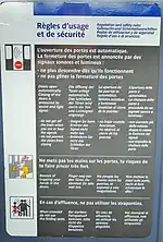 - anglais, dont le texte, qui est le plus court, est celui qui insiste le moins sur la perspective de la douleur : « Beware of trapping your hands in the doors. » ;