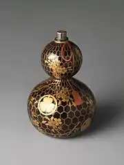 - maki-e (蒔絵) utilisant des poudres métalliques, y compris l'or, l'argent, le cuivre et leurs alliages, étalés avec des tubes de bambou ou des pinceaux fins. En hiramaki-e, les poudres sont déposées sur la laque humide pour être ensuite recouvertes d'une autre couche de laque. Takamaki-e réalise un effet de relief élevé par couches répétées, y compris parfois l'ajout de charbon de bois, de sciure ou d'argile[27]. Togidashi-e consiste à recouvrir le maki-e original de plusieurs couches de laque, puis à le polir jusqu'à ce que le dessin soit visible[38].