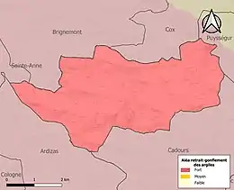 Le retrait-gonflement des sols argileux est susceptible d'engendrer des dommages importants aux bâtiments en cas d’alternance de périodes de sécheresse et de pluie. La totalité de la commune est en aléa moyen ou fort (88,8 % au niveau départemental et 48,5 % au niveau national). Sur les 89 bâtiments dénombrés sur la commune en 2019, 89 sont en aléa moyen ou fort, soit 100 %, à comparer aux 98 % au niveau départemental et 54 % au niveau national. Une cartographie de l'exposition du territoire national au retrait gonflement des sols argileux est disponible sur le site du BRGM[22],[Carte 1].