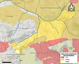 Le retrait-gonflement des sols argileux est susceptible d'engendrer des dommages importants aux bâtiments en cas d’alternance de périodes de sécheresse et de pluie. 96,2 % de la superficie communale est en aléa moyen ou fort (26,8 % au niveau départemental et 48,5 % au niveau national). Sur les 679 bâtiments dénombrés sur la commune en 2019, 674 sont en aléa moyen ou fort, soit 99 %, à comparer aux 36 % au niveau départemental et 54 % au niveau national. Une cartographie de l'exposition du territoire national au retrait gonflement des sols argileux est disponible sur le site du BRGM[23],[Carte 2].