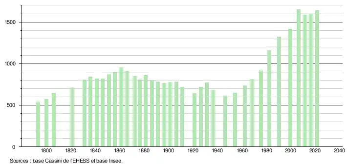 L'évolution du nombre d'habitants est connue à travers les recensements de la population effectués dans la commune depuis 1793. Pour les communes de moins de 10 000 habitants, une enquête de recensement portant sur toute la population est réalisée tous les cinq ans, les populations légales des années intermédiaires étant quant à elles estimées par interpolation ou extrapolation[31]. Pour la commune, le premier recensement exhaustif entrant dans le cadre du nouveau dispositif a été réalisé en 2006[32].