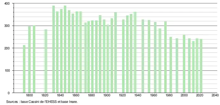 L'évolution du nombre d'habitants est connue à travers les recensements de la population effectués dans la commune depuis 1793. Pour les communes de moins de 10 000 habitants, une enquête de recensement portant sur toute la population est réalisée tous les cinq ans, les populations légales des années intermédiaires étant quant à elles estimées par interpolation ou extrapolation[21]. Pour la commune, le premier recensement exhaustif entrant dans le cadre du nouveau dispositif a été réalisé en 2006[22].