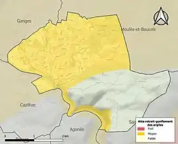 La commune est vulnérable au risque de mouvements de terrains constitué principalement du retrait-gonflement des sols argileux[20]. Cet aléa est susceptible d'engendrer des dommages importants aux bâtiments en cas d’alternance de périodes de sécheresse et de pluie. 64,7 % de la superficie communale est en aléa moyen ou fort (59,3 % au niveau départemental et 48,5 % au niveau national). Sur les 765 bâtiments dénombrés sur la commune en 2019, 765 sont en aléa moyen ou fort, soit 100 %, à comparer aux 85 % au niveau départemental et 54 % au niveau national. Une cartographie de l'exposition du territoire national au retrait gonflement des sols argileux est disponible sur le site du BRGM[21],[Carte 2].