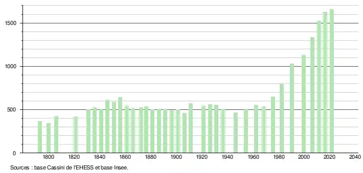 L'évolution du nombre d'habitants est connue à travers les recensements de la population effectués dans la commune depuis 1793. Pour les communes de moins de 10 000 habitants, une enquête de recensement portant sur toute la population est réalisée tous les cinq ans, les populations légales des années intermédiaires étant quant à elles estimées par interpolation ou extrapolation[26]. Pour la commune, le premier recensement exhaustif entrant dans le cadre du nouveau dispositif a été réalisé en 2006[27].