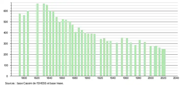 L'évolution du nombre d'habitants est connue à travers les recensements de la population effectués dans la commune depuis 1793. Pour les communes de moins de 10 000 habitants, une enquête de recensement portant sur toute la population est réalisée tous les cinq ans, les populations légales des années intermédiaires étant quant à elles estimées par interpolation ou extrapolation[20]. Pour la commune, le premier recensement exhaustif entrant dans le cadre du nouveau dispositif a été réalisé en 2008[21].