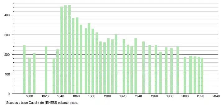 L'évolution du nombre d'habitants est connue à travers les recensements de la population effectués dans la commune depuis 1793. Pour les communes de moins de 10 000 habitants, une enquête de recensement portant sur toute la population est réalisée tous les cinq ans, les populations légales des années intermédiaires étant quant à elles estimées par interpolation ou extrapolation[55]. Pour la commune, le premier recensement exhaustif entrant dans le cadre du nouveau dispositif a été réalisé en 2007[56].