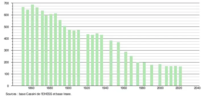 Le nombre d'exploitations agricoles en activité et ayant leur siège dans la commune est passé de 34 lors du recensement agricole de 1988[Note 8] à 24 en 2000 puis à 23 en 2010[30] et enfin à 25 en 2020[Carte 6], soit une baisse de 26 % en 32 ans. Le même mouvement est observé à l'échelle du département qui a perdu pendant cette période 51 % de ses exploitations[31],[Carte 7]. La surface agricole utilisée sur la commune a quant à elle augmenté, passant de 1 386 ha en 1988 à 1 519 ha en 2020[Carte 8]. Parallèlement la surface agricole utilisée moyenne par exploitation a augmenté, passant de 41 à 61 ha[30].
