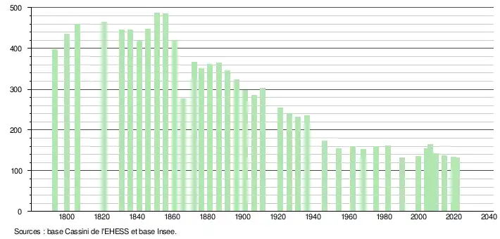 L'évolution du nombre d'habitants est connue à travers les recensements de la population effectués dans la commune depuis 1793. Pour les communes de moins de 10 000 habitants, une enquête de recensement portant sur toute la population est réalisée tous les cinq ans, les populations légales des années intermédiaires étant quant à elles estimées par interpolation ou extrapolation[28]. Pour la commune, le premier recensement exhaustif entrant dans le cadre du nouveau dispositif a été réalisé en 2004[29].