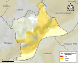 Le retrait-gonflement des sols argileux est susceptible d'engendrer des dommages importants aux bâtiments en cas d’alternance de périodes de sécheresse et de pluie. 47,1 % de la superficie communale est en aléa moyen ou fort (67,7 % au niveau départemental et 48,5 % au niveau national). Sur les 123 bâtiments dénombrés sur la commune en 2019, 103 sont en aléa moyen ou fort, soit 84 %, à comparer aux 72 % au niveau départemental et 54 % au niveau national. Une cartographie de l'exposition du territoire national au retrait gonflement des sols argileux est disponible sur le site du BRGM[21],[Carte 2].