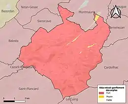 Le retrait-gonflement des sols argileux est susceptible d'engendrer des dommages importants aux bâtiments en cas d’alternance de périodes de sécheresse et de pluie. La totalité de la commune est en aléa moyen ou fort (88,8 % au niveau départemental et 48,5 % au niveau national). Sur les 171 bâtiments dénombrés sur la commune en 2019, 171 sont en aléa moyen ou fort, soit 100 %, à comparer aux 98 % au niveau départemental et 54 % au niveau national. Une cartographie de l'exposition du territoire national au retrait gonflement des sols argileux est disponible sur le site du BRGM[28],[Carte 3].