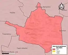 Le retrait-gonflement des sols argileux est susceptible d'engendrer des dommages importants aux bâtiments en cas d’alternance de périodes de sécheresse et de pluie. La totalité de la commune est en aléa moyen ou fort (94,5 % au niveau départemental et 48,5 % au niveau national). Sur les 94 bâtiments dénombrés sur la commune en 2019, 94 sont en aléa moyen ou fort, soit 100 %, à comparer aux 93 % au niveau départemental et 54 % au niveau national. Une cartographie de l'exposition du territoire national au retrait gonflement des sols argileux est disponible sur le site du BRGM[22],[Carte 3].
