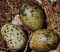 La femelle pond le plus souvent trois œufs de couleur variable (blanc verdâtre, beige ou beige verdâtre) mais toujours tachetés de brun. Le pourcentage de pontes à trois œufs varie de 78 % à 91 % selon les études[13]. Ces œufs mesurent en moyenne 71 × 49 mm, avec pour valeurs extrêmes 58,0-82,7 mm × 44,1-54,8 mm[12], pour une masse moyenne de 42 g (dont 7 % de coquille). Des études tendent à montrer que plus la femelle est bien nourrie avant la ponte, plus les œufs auront des dimensions moyennes élevées, et plus les petits seront vigoureux[18]. Les œufs sont pondus à intervalles irréguliers, généralement de un à trois jours, le plus souvent de deux jours[16].