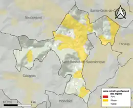 La commune est vulnérable au risque de mouvements de terrains constitué principalement du retrait-gonflement des sols argileux[21]. Cet aléa est susceptible d'engendrer des dommages importants aux bâtiments en cas d’alternance de périodes de sécheresse et de pluie. 33,9 % de la superficie communale est en aléa moyen ou fort (67,5 % au niveau départemental et 48,5 % au niveau national). Sur les 610 bâtiments dénombrés sur la commune en 2019, 439 sont en aléa moyen ou fort, soit 72 %, à comparer aux 90 % au niveau départemental et 54 % au niveau national. Une cartographie de l'exposition du territoire national au retrait gonflement des sols argileux est disponible sur le site du BRGM[22],[Carte 2].