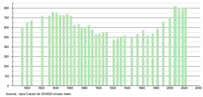 | L'évolution du nombre d'habitants est connue à travers les recensements de la population effectués dans la commune depuis 1793. Pour les communes de moins de 10 000 habitants, une enquête de recensement portant sur toute la population est réalisée tous les cinq ans, les populations légales des années intermédiaires étant quant à elles estimées par interpolation ou extrapolation[30]. Pour la commune, le premier recensement exhaustif entrant dans le cadre du nouveau dispositif a été réalisé en 2007[31]. En 2021, la commune comptait 803 habitants[Note 10], en augmentation de 0,75 % par rapport à 2015 (Aude : +2,47 %, France hors Mayotte : +1,84 %). |