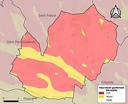 Le retrait-gonflement des sols argileux est susceptible d'engendrer des dommages importants aux bâtiments en cas d’alternance de périodes de sécheresse et de pluie. La totalité de la commune est en aléa moyen ou fort (75,2 % au niveau départemental et 48,5 % au niveau national). Sur les 376 bâtiments dénombrés sur la commune en 2019, 376 sont en aléa moyen ou fort, soit 100 %, à comparer aux 94 % au niveau départemental et 54 % au niveau national. Une cartographie de l'exposition du territoire national au retrait gonflement des sols argileux est disponible sur le site du BRGM[25],[Carte 3].