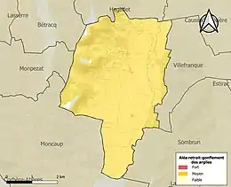 Le retrait-gonflement des sols argileux est susceptible d'engendrer des dommages importants aux bâtiments en cas d’alternance de périodes de sécheresse et de pluie. 98,6 % de la superficie communale est en aléa moyen ou fort (44,5 % au niveau départemental et 48,5 % au niveau national). Sur les 164 bâtiments dénombrés sur la commune en 2019, 164 sont en aléa moyen ou fort, soit 100 %, à comparer aux 75 % au niveau départemental et 54 % au niveau national. Une cartographie de l'exposition du territoire national au retrait gonflement des sols argileux est disponible sur le site du BRGM[22],[Carte 3].