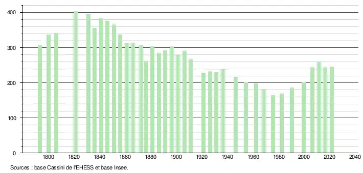 L'évolution du nombre d'habitants est connue à travers les recensements de la population effectués dans la commune depuis 1793. Pour les communes de moins de 10 000 habitants, une enquête de recensement portant sur toute la population est réalisée tous les cinq ans, les populations légales des années intermédiaires étant quant à elles estimées par interpolation ou extrapolation[37]. Pour la commune, le premier recensement exhaustif entrant dans le cadre du nouveau dispositif a été réalisé en 2006[38].