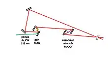 L'élément non linéaire permettant le blocage des modes réalise l'équivalent d'un absorbant saturable, qui possède des pertes à faible puissance crête mais en présente proportionnellement beaucoup moins à forte puissance optique. Cet absorbant saturable peut être réel et absorber le rayonnement plus ou moins en fonction de la puissance optique (miroir SESAM par exemple), ou bien effectif, en utilisant, par exemple, l'effet Kerr de polarisation ou l'effet de lentille à effet Kerr. La seconde méthode permet, en général, l'obtention d'impulsions plus courtes, alors que la première est, en principe, considérée comme plus facile à mettre en œuvre.
