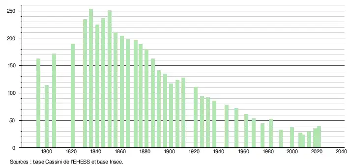 | L'évolution du nombre d'habitants est connue à travers les recensements de la population effectués dans la commune depuis 1793. Pour les communes de moins de 10 000 habitants, une enquête de recensement portant sur toute la population est réalisée tous les cinq ans, les populations légales des années intermédiaires étant quant à elles estimées par interpolation ou extrapolation[37]. Pour la commune, le premier recensement exhaustif entrant dans le cadre du nouveau dispositif a été réalisé en 2008[38]. En 2021, la commune comptait 39 habitants[Note 7], en augmentation de 30 % par rapport à 2015 (Hautes-Pyrénées : +1,04 %, France hors Mayotte : +1,84 %). |