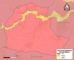 Les mouvements de terrains susceptibles de se produire sur la commune sont des tassements différentiels[18]. Le retrait-gonflement des sols argileux est susceptible d'engendrer des dommages importants aux bâtiments en cas d’alternance de périodes de sécheresse et de pluie[19]. La totalité de la commune est en aléa moyen ou fort (79,5 % au niveau départemental et 48,5 % au niveau national)[Carte 2]. Depuis le , en application de la loi ÉLAN, différentes contraintes s'imposent aux vendeurs, maîtres d'ouvrages ou constructeurs de biens situés dans une zone classée en aléa moyen ou fort[Note 3],[20].
