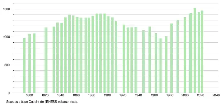 L'évolution du nombre d'habitants est connue à travers les recensements de la population effectués dans la commune depuis 1793. Pour les communes de moins de 10 000 habitants, une enquête de recensement portant sur toute la population est réalisée tous les cinq ans, les populations légales des années intermédiaires étant quant à elles estimées par interpolation ou extrapolation[24]. Pour la commune, le premier recensement exhaustif entrant dans le cadre du nouveau dispositif a été réalisé en 2007[25].