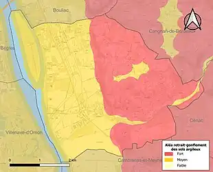 Le retrait-gonflement des sols argileux est susceptible d'engendrer des dommages importants aux bâtiments en cas d’alternance de périodes de sécheresse et de pluie. 96,9 % de la superficie communale est en aléa moyen ou fort (67,4 % au niveau départemental et 48,5 % au niveau national). Sur les 1 360 bâtiments dénombrés sur la commune en 2019, 1 360 sont en aléa moyen ou fort, soit 100 %, à comparer aux 84 % au niveau départemental et 54 % au niveau national. Une cartographie de l'exposition du territoire national au retrait gonflement des sols argileux est disponible sur le site du BRGM[24],[Carte 2].