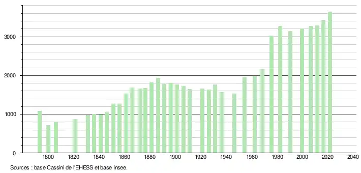 L'évolution du nombre d'habitants est connue à travers les recensements de la population effectués dans la commune depuis 1793. Pour les communes de moins de 10 000 habitants, une enquête de recensement portant sur toute la population est réalisée tous les cinq ans, les populations légales des années intermédiaires étant quant à elles estimées par interpolation ou extrapolation[28]. Pour la commune, le premier recensement exhaustif entrant dans le cadre du nouveau dispositif a été réalisé en 2006[29].