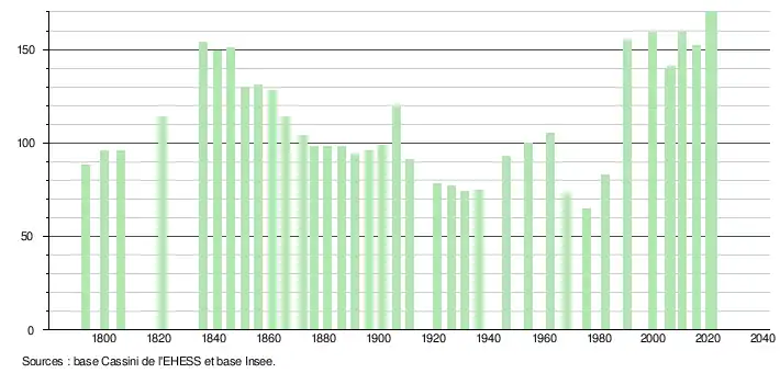 L'évolution du nombre d'habitants est connue à travers les recensements de la population effectués dans la commune depuis 1793. Pour les communes de moins de 10 000 habitants, une enquête de recensement portant sur toute la population est réalisée tous les cinq ans, les populations légales des années intermédiaires étant quant à elles estimées par interpolation ou extrapolation[15]. Pour la commune, le premier recensement exhaustif entrant dans le cadre du nouveau dispositif a été réalisé en 2005[16].