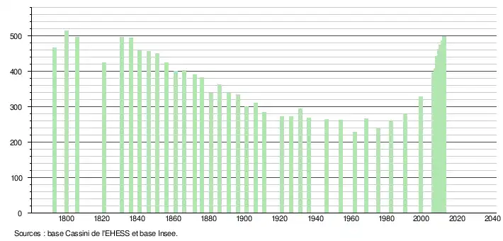 L'évolution du nombre d'habitants est connue à travers les recensements de la population effectués dans la commune depuis 1793. Pour les communes de moins de 10 000 habitants, une enquête de recensement portant sur toute la population est réalisée tous les cinq ans, les populations légales des années intermédiaires étant quant à elles estimées par interpolation ou extrapolation[21]. Pour la commune, le premier recensement exhaustif entrant dans le cadre du nouveau dispositif a été réalisé en 2007[22].