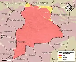 Le retrait-gonflement des sols argileux est susceptible d'engendrer des dommages importants aux bâtiments en cas d’alternance de périodes de sécheresse et de pluie. 99,8 % de la superficie communale est en aléa moyen ou fort (75,2 % au niveau départemental et 48,5 % au niveau national). Sur les 647 bâtiments dénombrés sur la commune en 2019, 647 sont en aléa moyen ou fort, soit 100 %, à comparer aux 94 % au niveau départemental et 54 % au niveau national. Une cartographie de l'exposition du territoire national au retrait gonflement des sols argileux est disponible sur le site du BRGM[23],[Carte 3].
